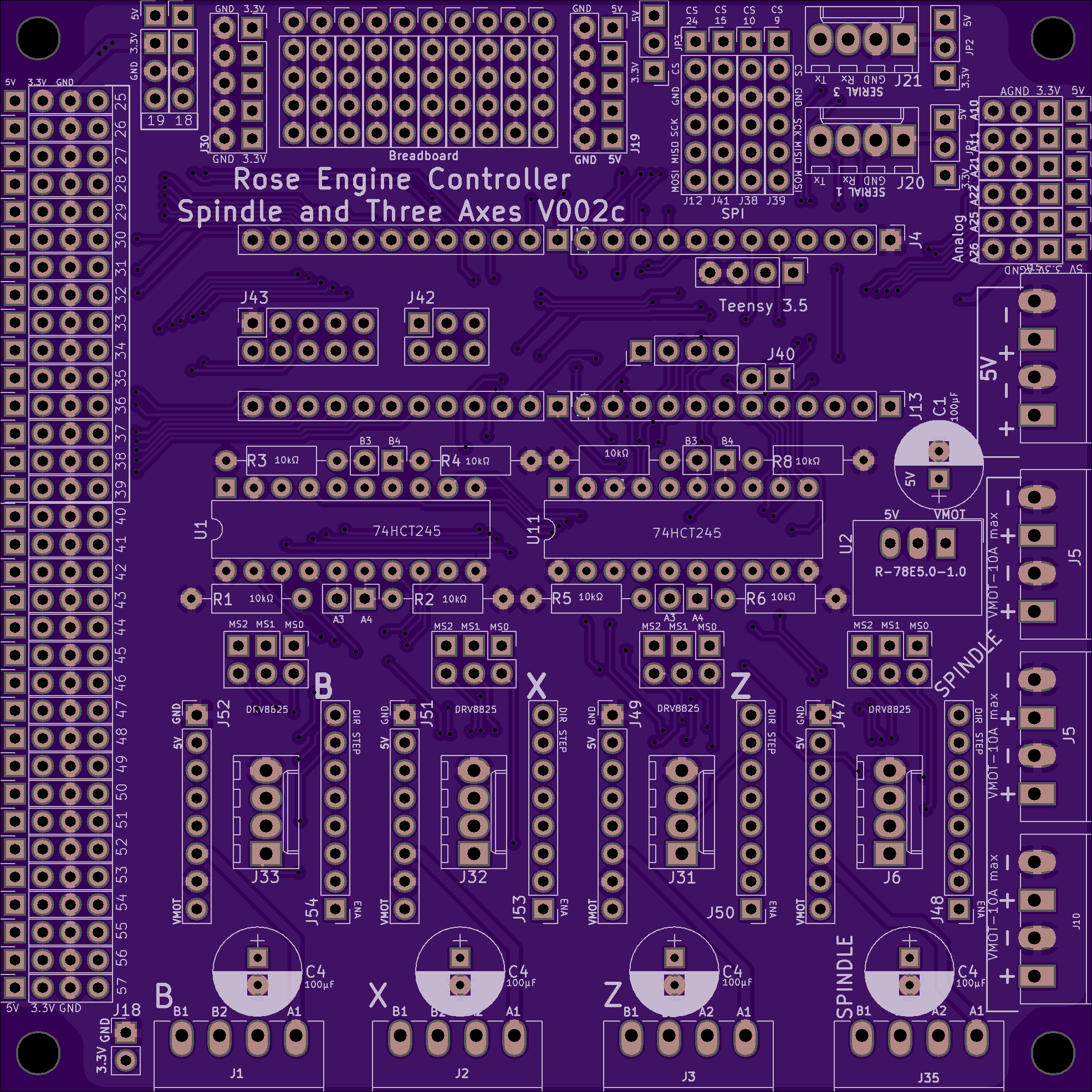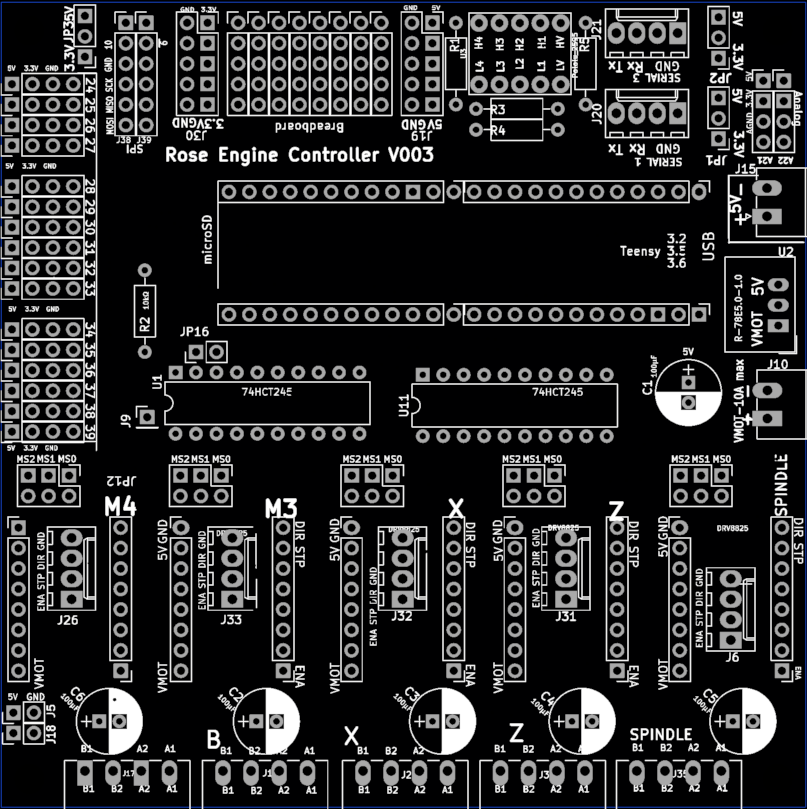 The 5-axis PCB was designed with a Pololu 2595 daughter board for handling the voltage differences.