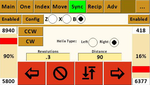 The fields on this screen are used with the fields and settings on the B Axis Configuration screen to calculate how long to run the stepper motor to achieve the desired rotation.