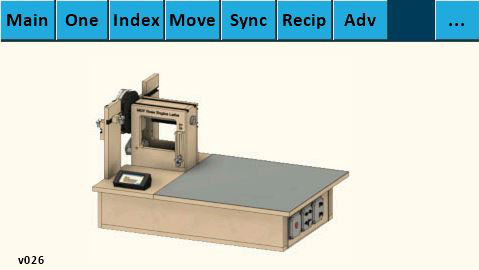 When you start the machine, the splash screen is shown as on the right. Touching one of the buttons on the top row will take you to that screen. You can click on the respective button on this page to get more details on what each does. This is a sophisticated program, so give it a few minutes to load. If you are new to using this machine, I recommend you start with the Main screen. You will have a lot to learn there before moving to other screens. The version you are using shows in the lower left corner of the opening screen. "v026" is shown here, denoting the use of version 26. For version upgrades, click here. | |||||||||||||||||||||||